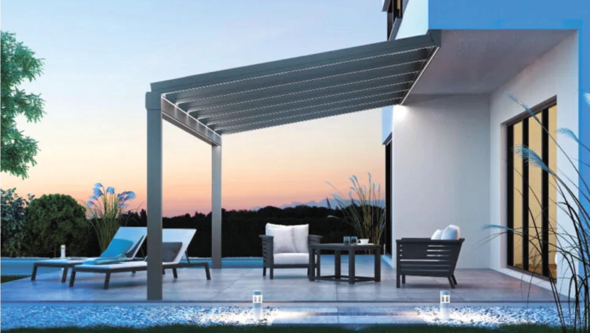- Modulares Zubehör wie LED-Beleuchtung, Glasschiebewände, Festverglasungen oder Heizstrahler zur Aufwertung des Außenraums.