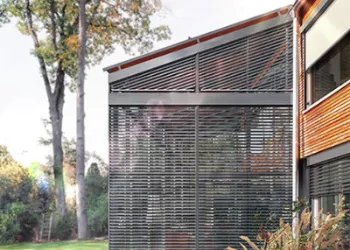 - Fenster-System-Außenjalousie: Diese Jalousien integrieren sich verdeckt oder sichtbar in die Fassade. Sie eignen sich hervorragend als Gestaltungselement. Eine zusätzliche Blendenbefestigung entfällt, wodurch keine Wärmebrücken entstehen. Eine filigrane Seilführung oder Seil-/Schienenkombination erweitert die gestalterischen Möglichkeiten.